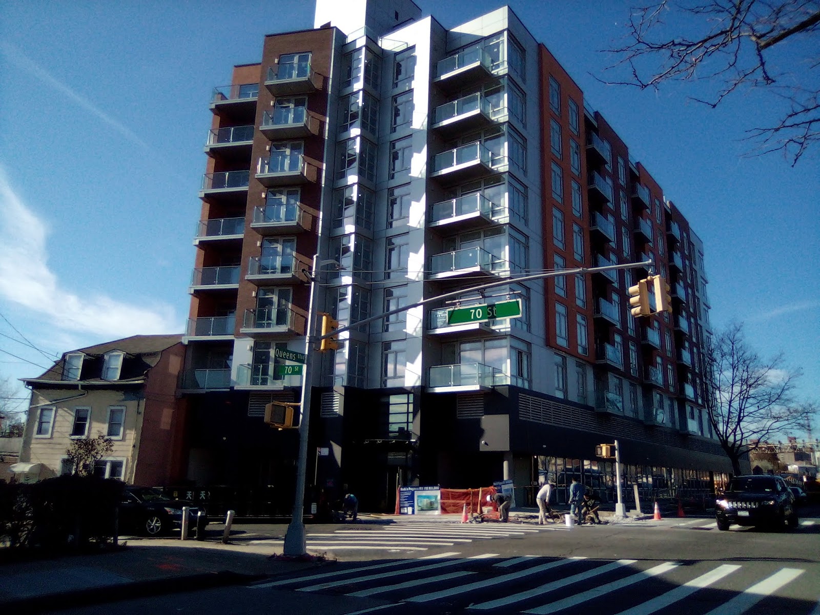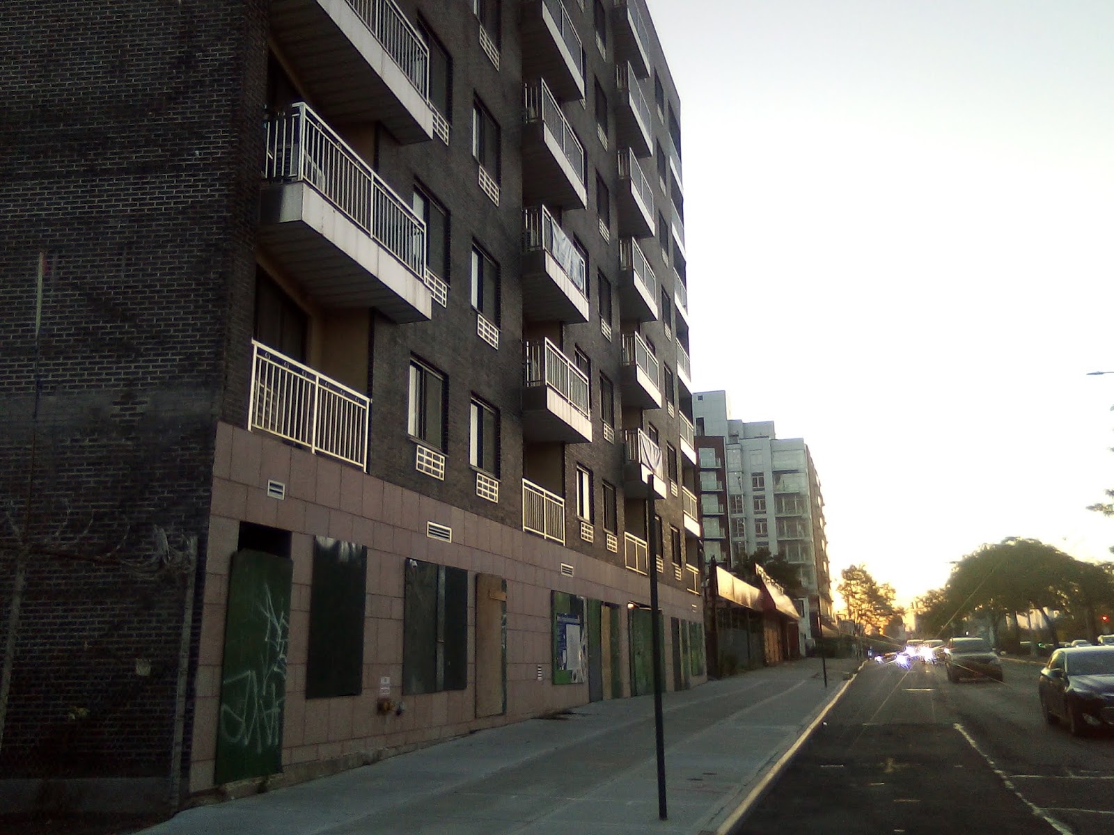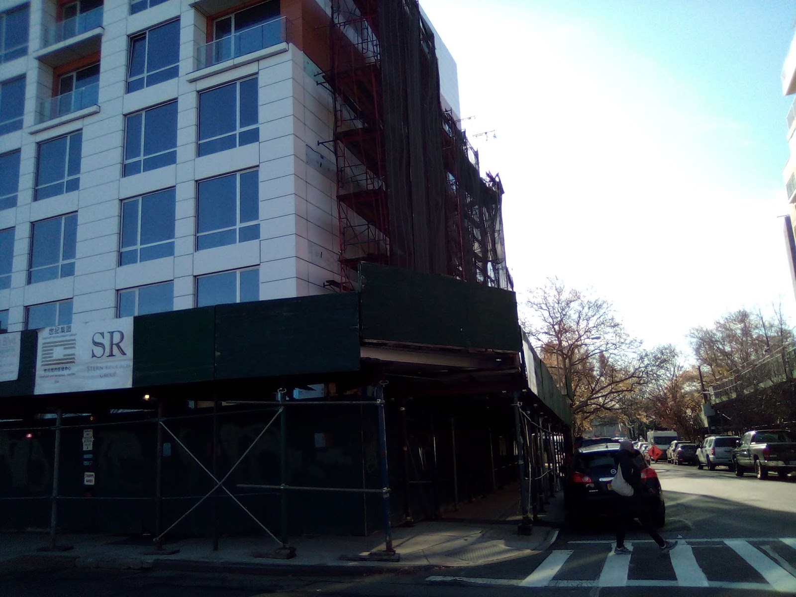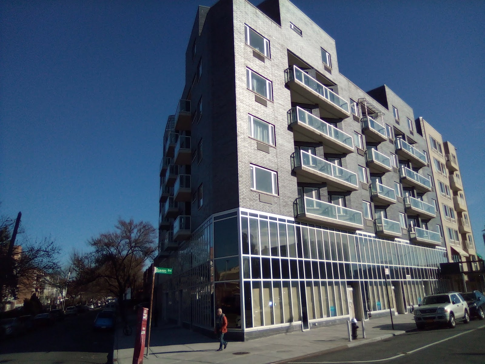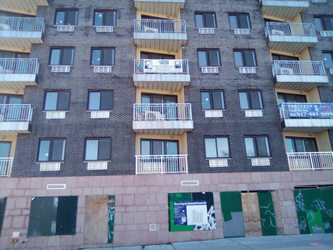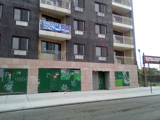 Remember when Queens Boulevard was called the boulevard of death? Because of the high amount of vehicular accidents that put the fear of death in pedestrians that out of necessity would dare to tread across the four lane quasi-highway? Well, it has got comparably safer to commute and cross than in the past, but it has been replaced by a new form of existential threat, and that is over-development. With this post, I bring forth three technically new buildings that have been built but have remained strangely unfinished and apparently have yet to be occupied. (But strangely they are already on the market).