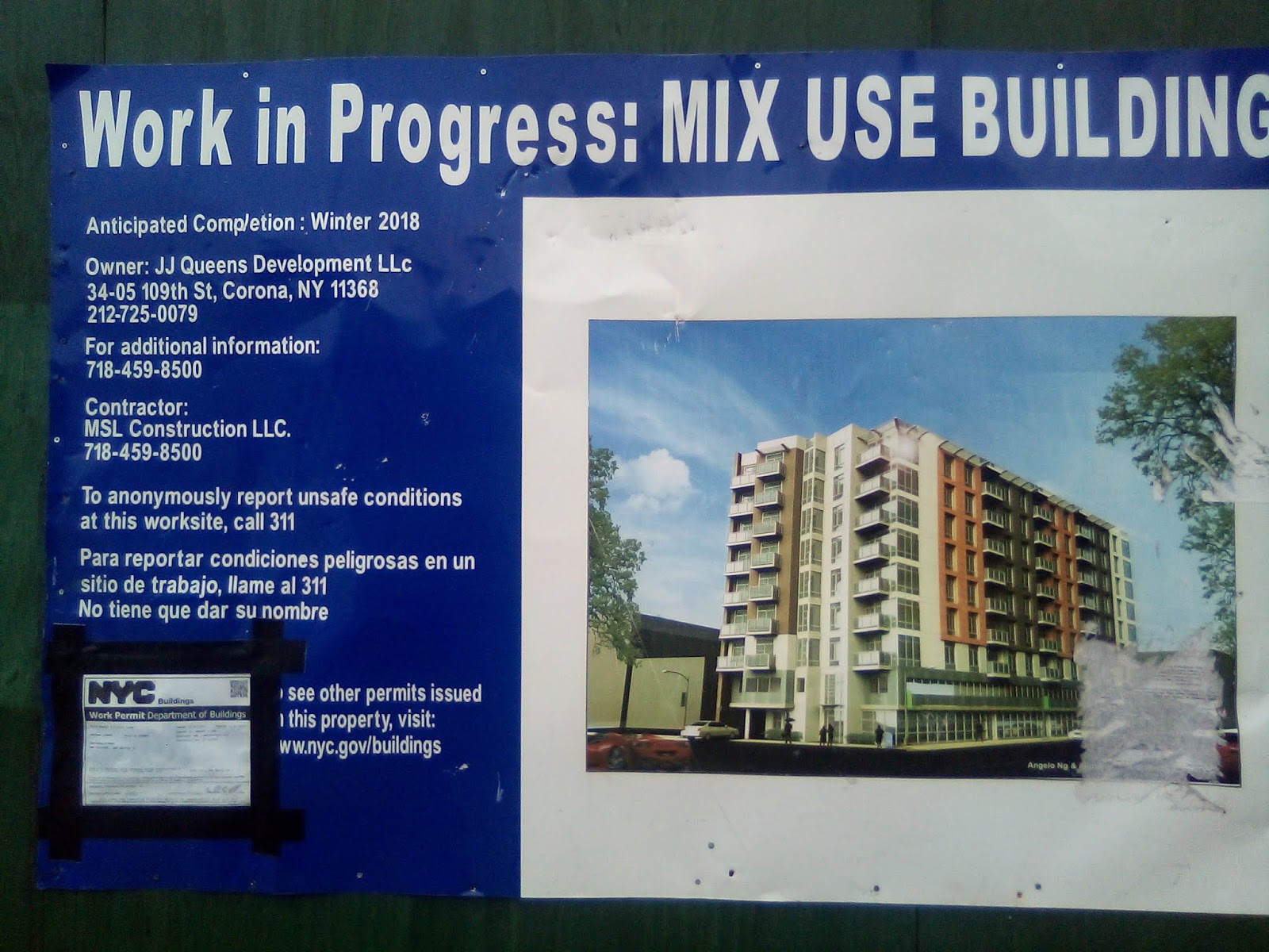 This fugly zombie condo complex by the Queens Center Mall is a year late too.