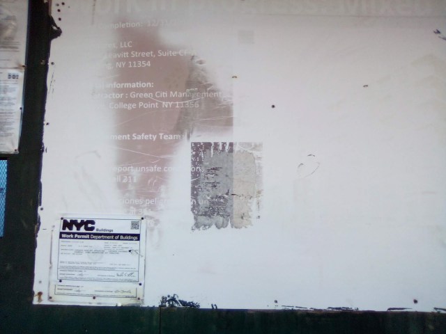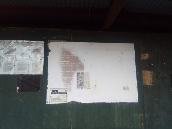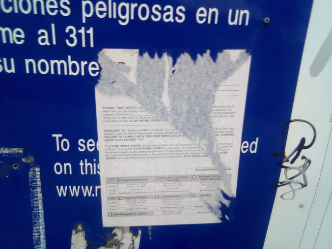 And the same placards still remain too, even the scraped stop work order wasn’t even removed by the elements or even a dabble of goo gone. Which doesn’t do much to ward off suspicion about why this building is still like this for so much time. And it’s safe to presume that there is no “affordable housing” in these complexes because the developments were initiated before de Blasio’s bullshit Housing New York program got implemented.