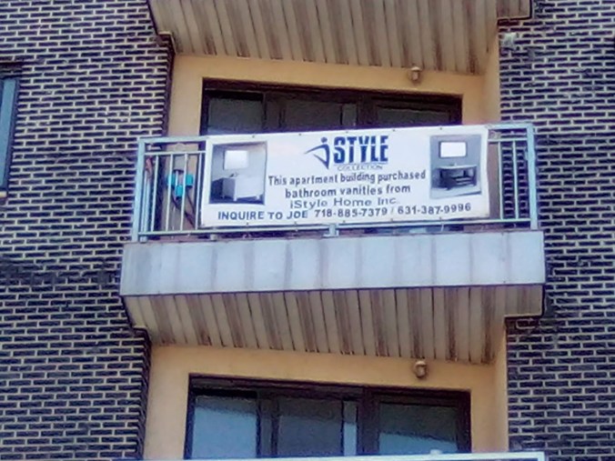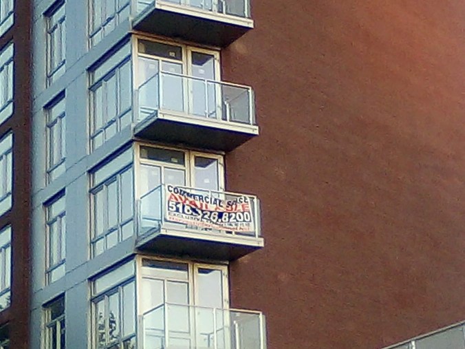 …and to go along with the eerie vibe when one passes by, it seems the zombie condo building has become haunted. Because some entity or apparition put up some real estate banners on some of the crappy little balconies on the higher floors.