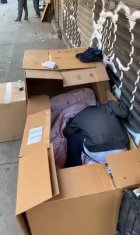 In Flushing, a homeless man was found dead in a box in front of a store with the gate down.