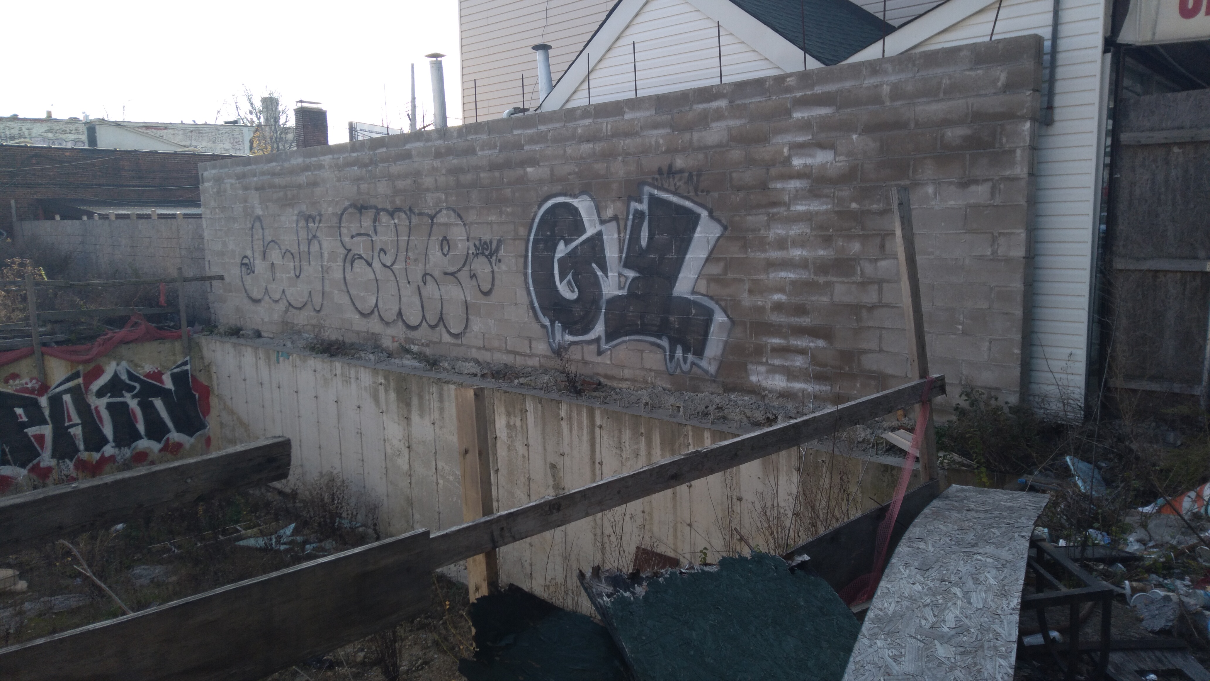 Just some standard tagging, no offense to the artists oevure. Also standard but more varietal was the detritus strewn on the platform of the spacious lot, with a piece of the breached wall lying askew on a shoddily structured fence.