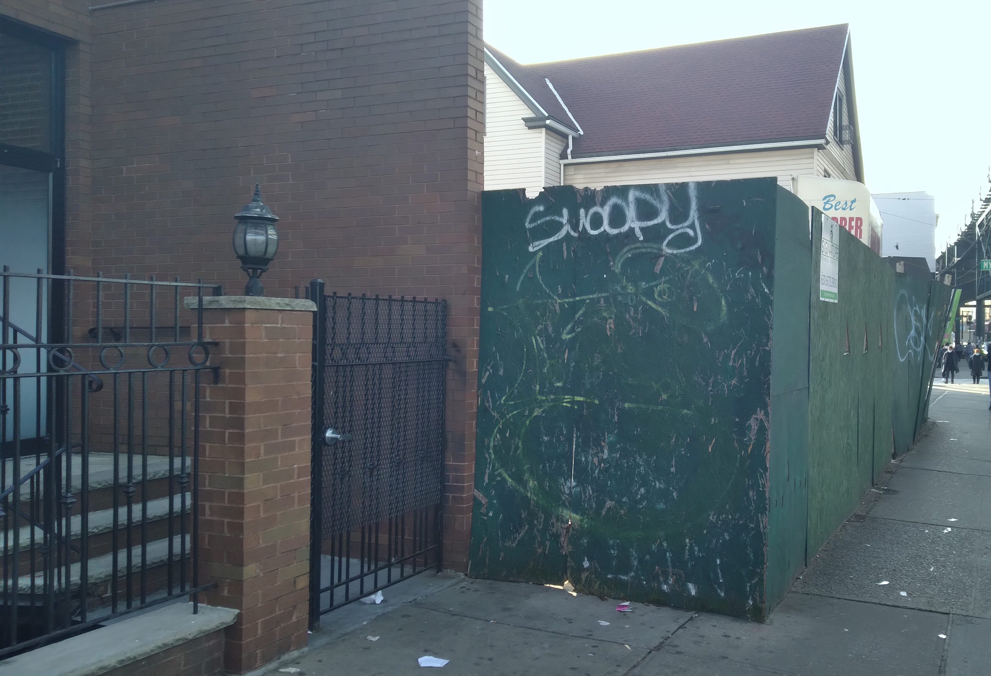 On the day after the six-alarm fire that destroyed the homes above storefronts in Richmond Hill and taking pics of the charred windows on the buildings, strolling about 8 blocks east by Lefferts Blvd. there exists this unsightly gated wall protruding on the sidewalk next to a barber shop and a ministry. I call it a gated wall because it’s secured with a lock and chain.