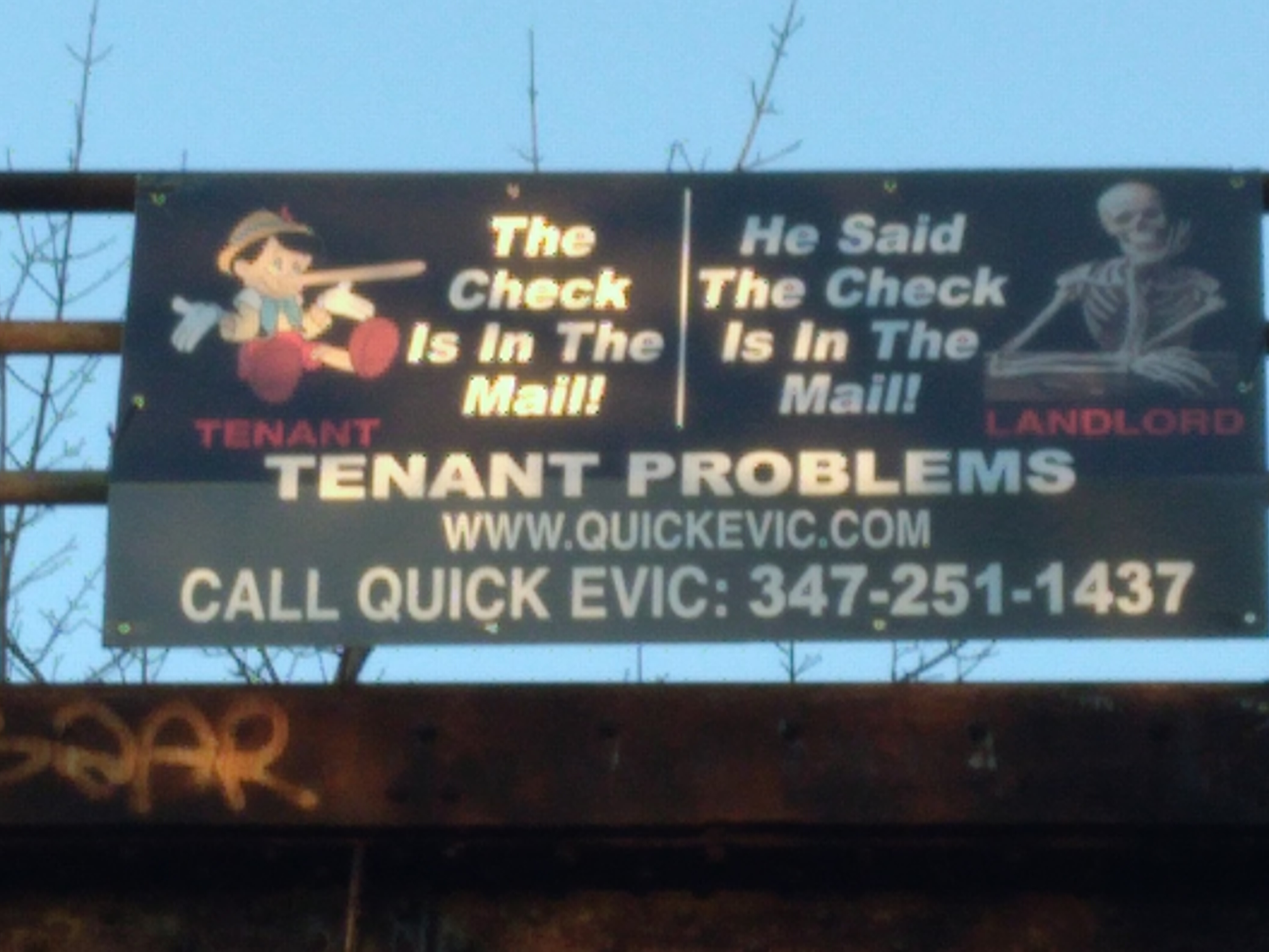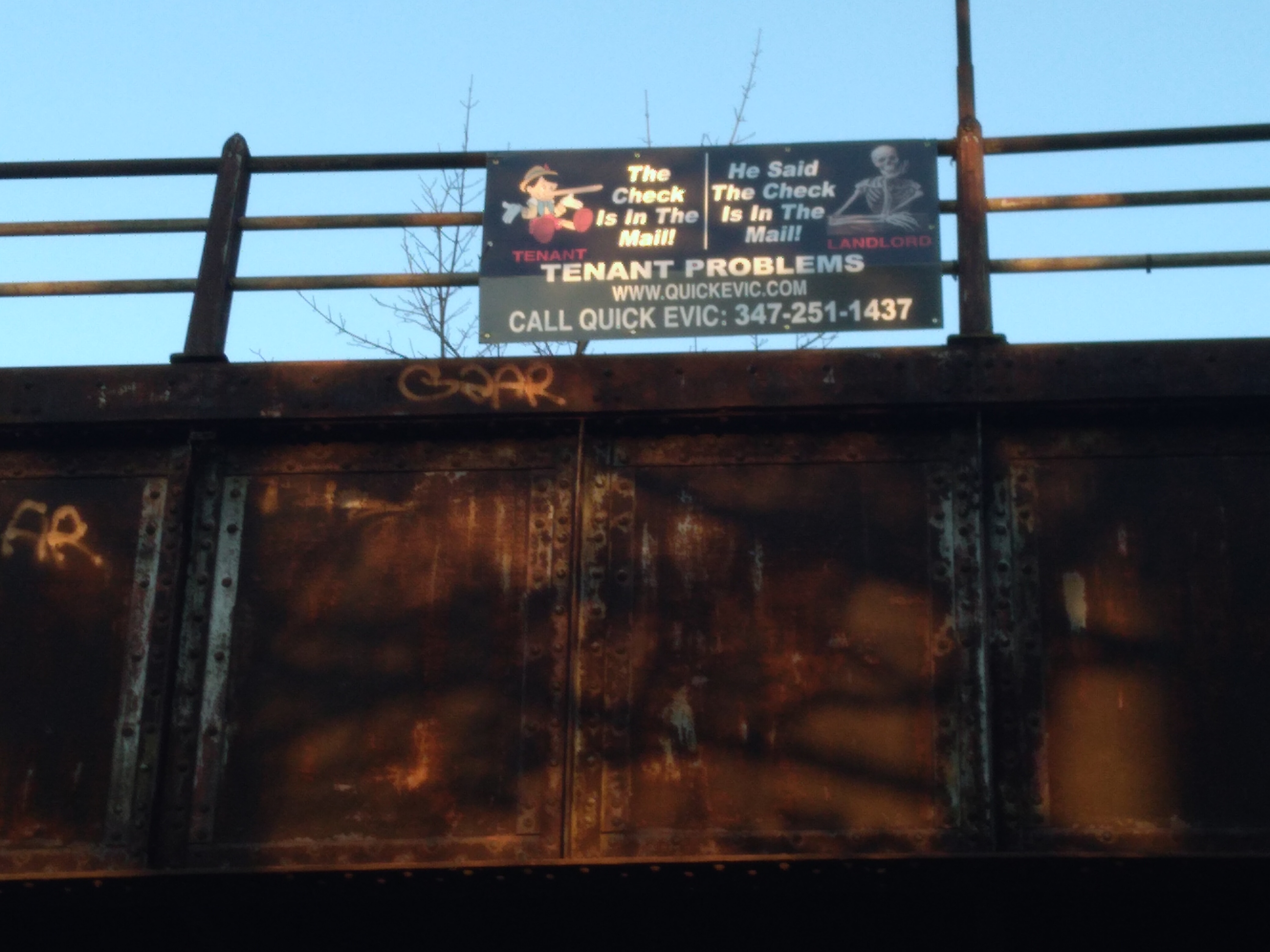 This heinous predatory advertisement is hanging, or more appropriately and ironically squatting rent free on the railing of the abandoned Rockaway Rail Line on Atlantic Avenue in Ozone Park. This enterprise probably and presumably illegally hung this up here assuming that the eviction moratorium will expire on schedule on the new year.