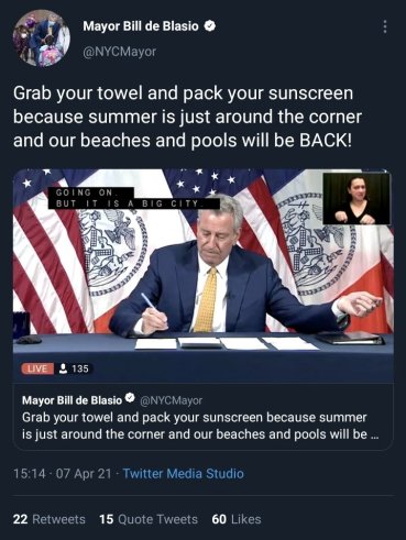 So it makes sense that the mayor would prioritize entertainment over his constituents for the city to come back to normalcy, because he’s been acting more like an executive producer than a mayor or even a leader. Which is why he’s been coming up with shit like the Open Culture NYC and emceeing reopenings at entertainment venues at BAM and Lincoln Center and announcing the scheduled reopening of beaches with Spring only 2 weeks old.