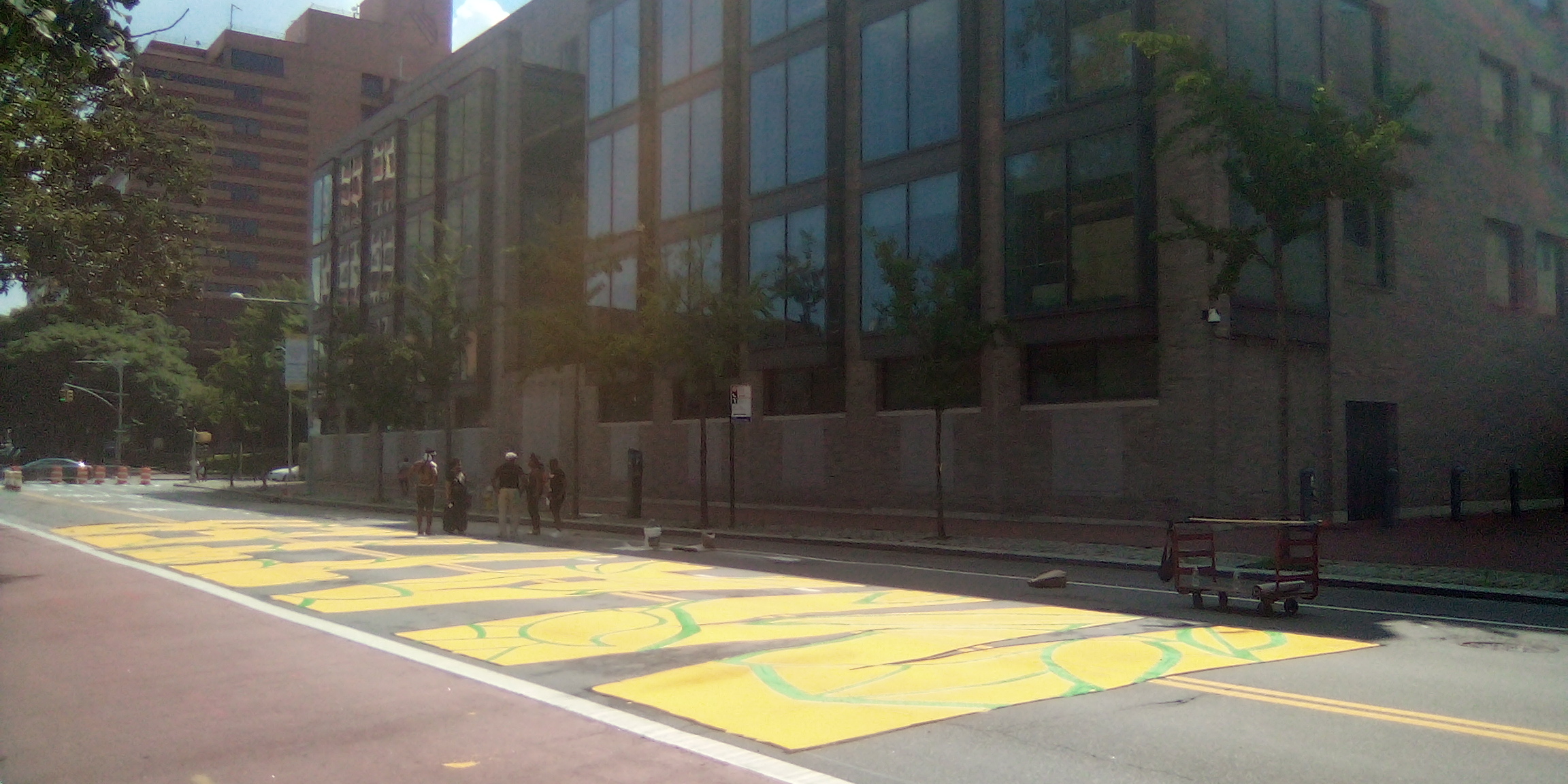 It’s clear that the Jamaica Ave. mural didn’t get the same protection as the Brooklyn and Midtown Manhattan ones, the latter two benefiting from the presence of steel barricades, leading to traffic getting diverted away from the murals. While the one in Jamaica looks as if the avenue was never shut down to traffic on the day after the painting was completed, plus how this strip on Jamaica Ave., right by a city park no less, obviously was never considered to be part of the city’s open streets program.