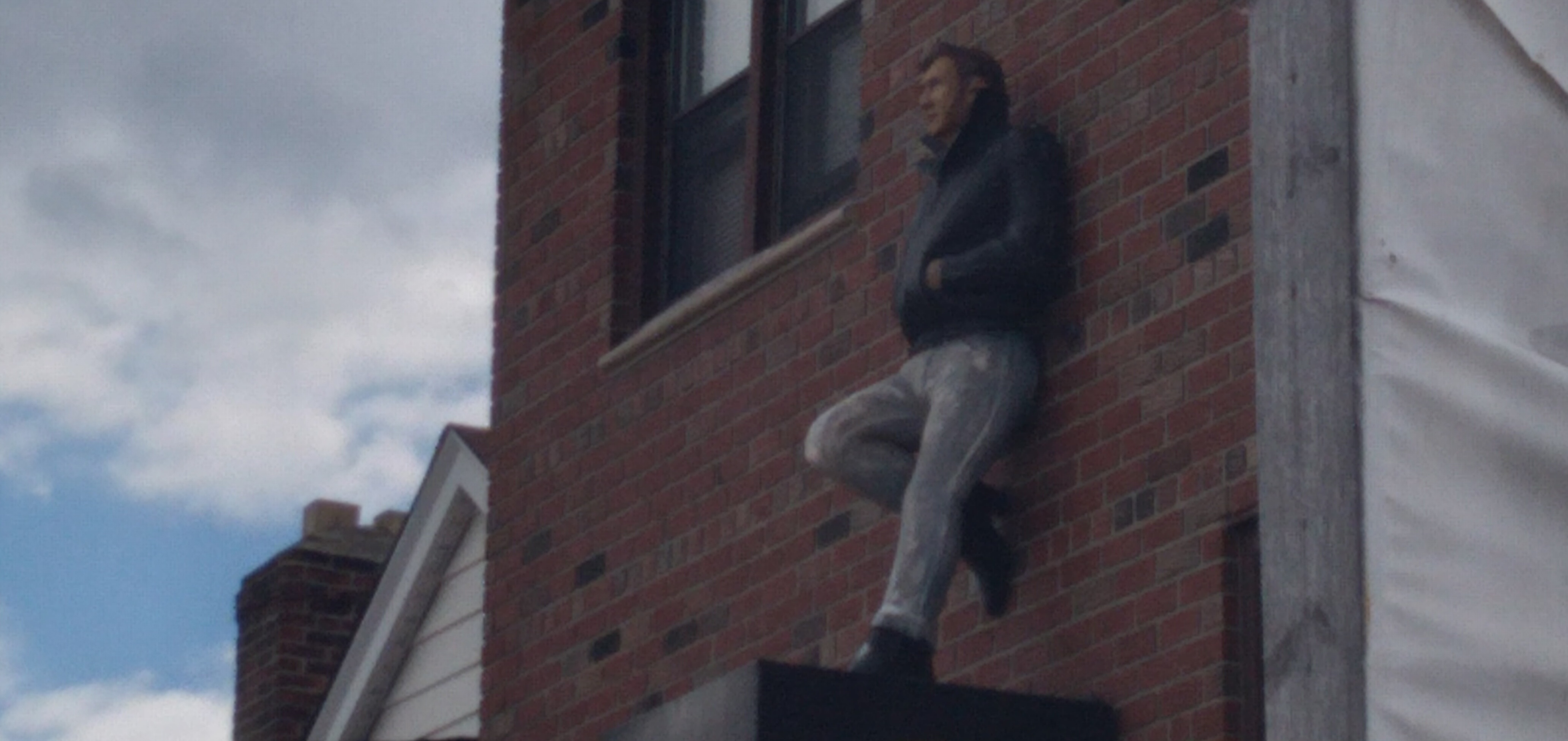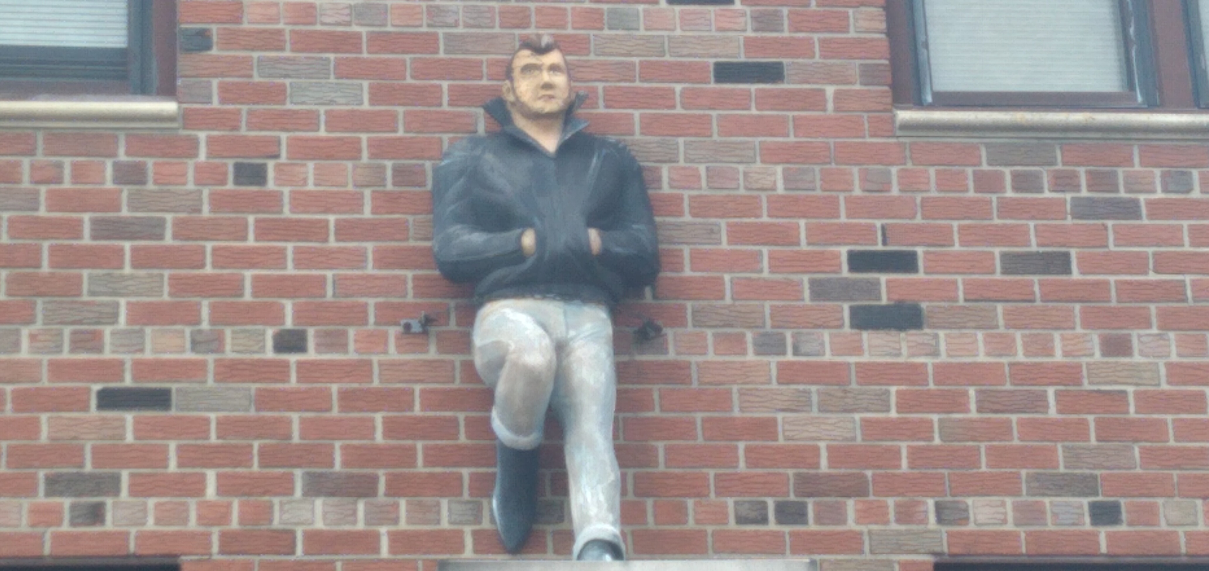 Hoisted up on an office building along Cross Bay Boulevard, a statue of a ’50s greaser clad in blue jeans — hands thrust into the pockets of a black leather jacket — leans back on the brick facade of a law office at 109th Avenue.