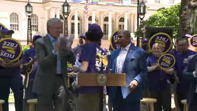 “For over 4,000 working families – their lives are going to change, this year,” said Mayor DeBlasio at a press conference this afternoon. A group of working people, each wearing union shirts, stood behind him. “You can’t ask someone to help solve one of the most challenging problems in society, but not give them enough to put food on their tables, or pay their rent, or take care of their families.”