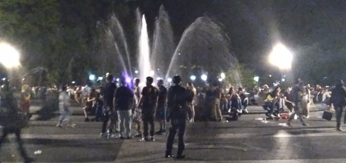 This gang would come in spurts throughout the day and night, riding around the fountain and by people sitting on benches with total impunity. The predominant demographics of young and youngish people at the park didn’t mind them at all, and some older holdover park goers handled it with visible jadedness.