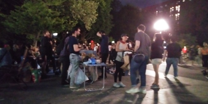 As the minutes got closer to midnight, the park was still at peak vibrancy. The park denizens didn’t even notice or gave a damn about the NYPD’s presence. Amongst the cacophony of cranked music and loud chatter of the thousands of people in the park that night, the WSP Mutual Fund distinctively stuck out. Instead of packing up their goods as the parks closing time was getting closer, they maintained their makeshift community station and more people assembled in their space. Plus they ordered more pizza to give away for free and laid out more free clothes to grab.