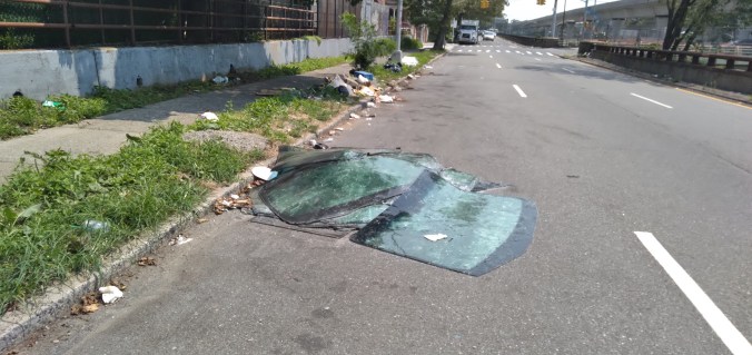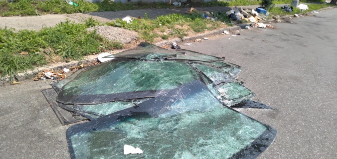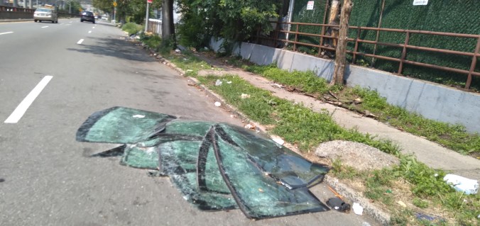 Someone couldn’t find a place to discard these windshields, but I can understand the logic leaving them on the street. In due time, cars will roll over them and the glass will be grounded naturally into the asphalt.