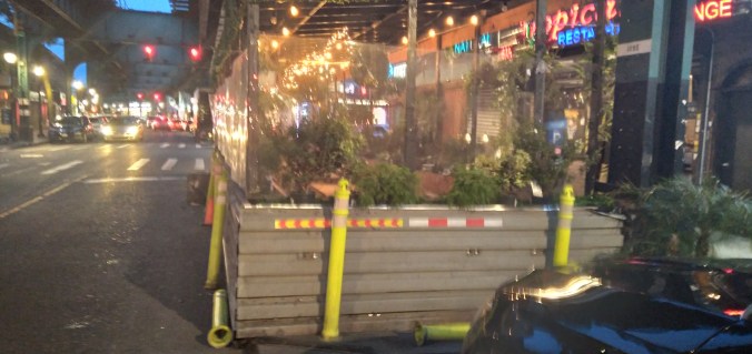 Since eating indoors was still a major risk of contagion for months on end last year, City Council and Mayor de Blasio addressed the existential threat the virus had on the dining and drinking industry and started the Open Restaurants initiative which lifted restrictions and eased regulations for restaurants to build sheds on the street curbs so patrons can come back and dine again outside of their establishments. Despite usurping parking spaces from residents, these businesses were able to recoup some losses and were able to make money again. The city also integrated this program with the Open Streets initiative to “re-imagine” public streets initially centered on cycling and pedestrian commuting by evolving them to plazas with the intent to foster community activity and keeping vehicular traffic out (both initiatives annoyingly prodded by bike zealot/car abolitionist lobby Transportation Alternatives). With the sheds on the asphalt, restaurants were able to extend their businesses by placing tables on the street, enabling to serve more customers. At the time it was logical and necessary.