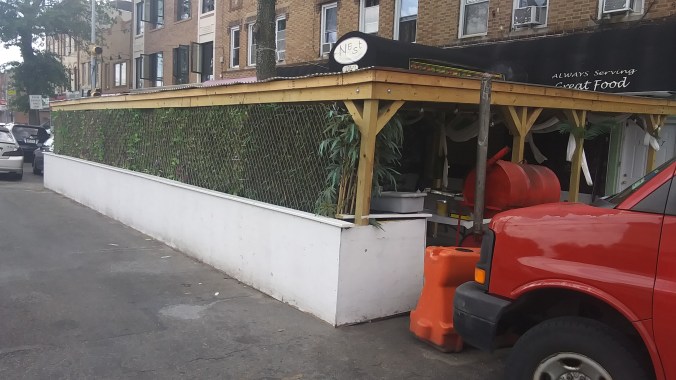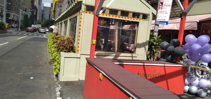 Watching that video would give the impression that it’s probably the tipping point or nadir of the open restaurant phenomenon and that the D.O.B. will stop by and tell the proprietor to take it down but you’d be wrong. Because these AC equipped cabins have set off an open restaurant land grab wave.