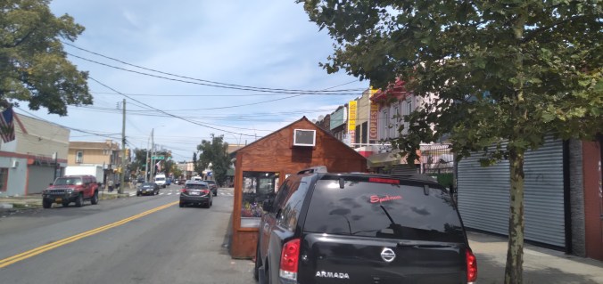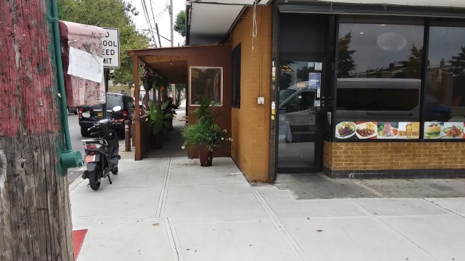 What makes this the most special of open restaurant shanties is that it’s built on a steep incline with traffic going south. which means there are probably steps inside there. While it doesn’t have energy sucking HVAC’s it does appear to have what looks like an air purifier releasing whatever delta variant strains the customers are dispensing inside and releasing the contagion into the ether and onto the public. Which makes a mockery of the vaccine mandate rules by conveying this as a safe outdoor venue for microbe aerosol dispensing dining and nightlife leisure activities.