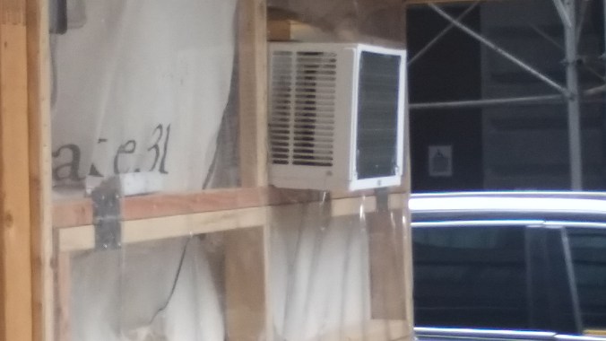 But some of these non-restaurant establishments probably serve liquor, making them able to take advantage of the city’s generous loopholes, like this greenhouse in front of this nite club. Complete with HVAC and door and lock. Also defeating the purpose of preventing virus contagion.