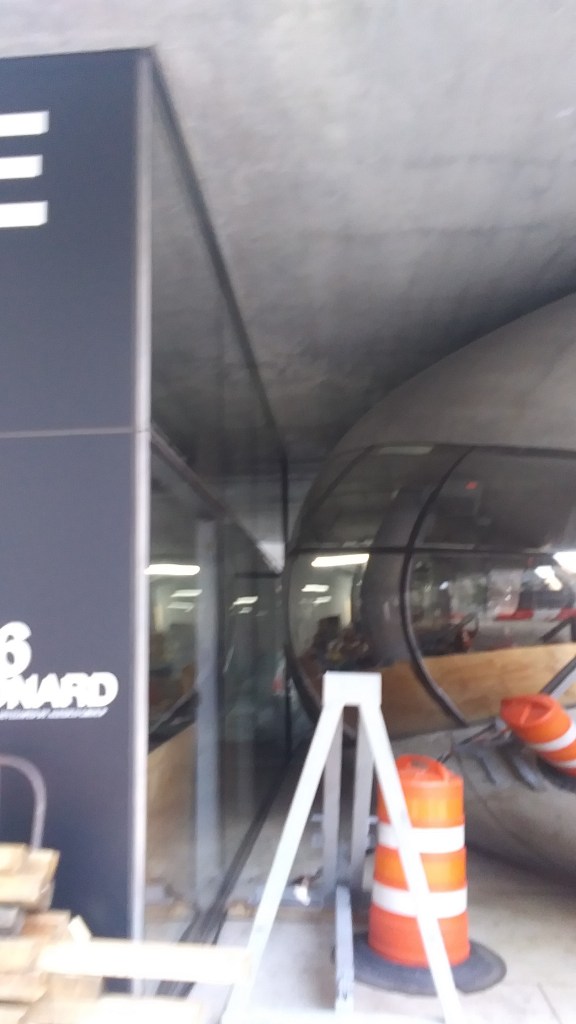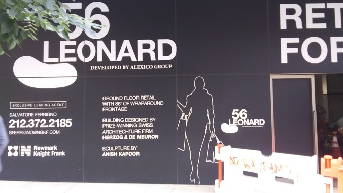 What makes the 56 Leonard St. tower truly unique might also be it’s biggest and oddest liability, and it’s the conspicuous gap at the base of the building between by the lobby and freight entrance on Church St. This anomaly was exposed in a posting by upscale developer propaganda blog YIMBY when they sent one of their intrepid reporters to scope out the penthouses at the luxury tower in one of their photos where the only bone that was propping up the 36 story building was single column next to the lobby and another column right next to the commercial space.