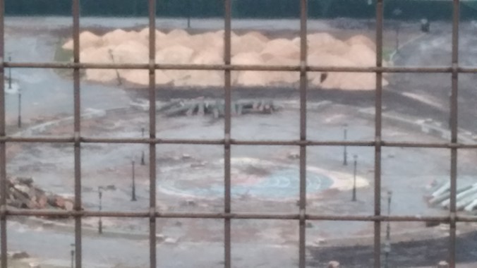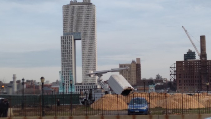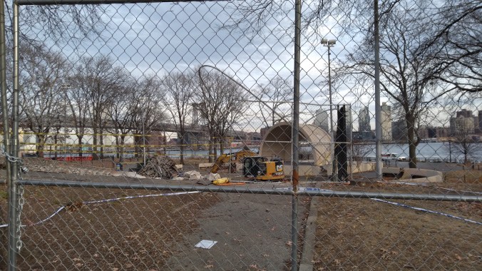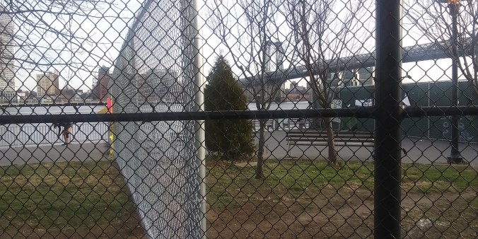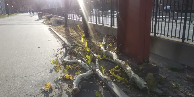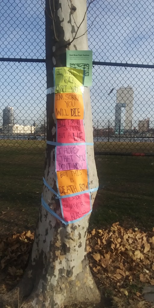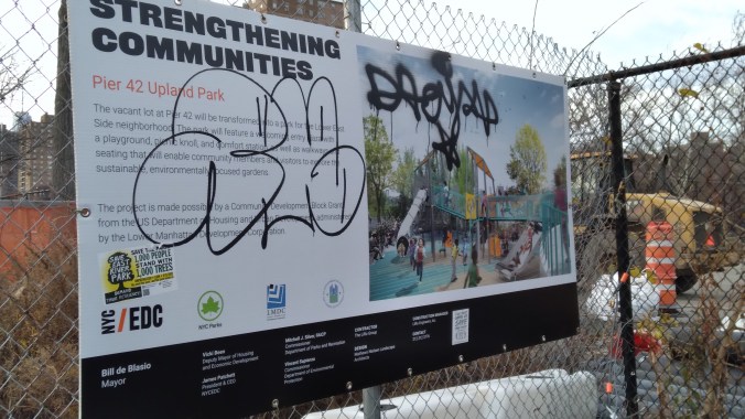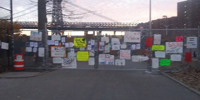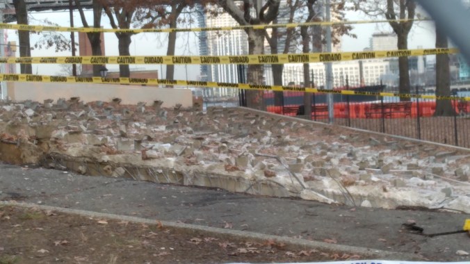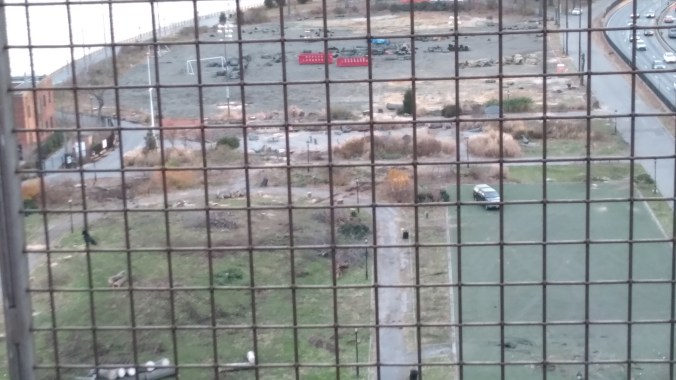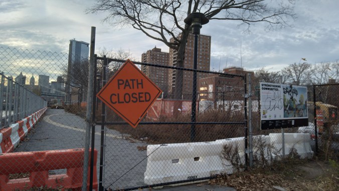 Even though the annihilation of East River Park has settled down after the non-stop week long massacre, evidence of what a crime scene The Blaz left behind are everywhere. Like the military brig fences that have blocked joggers and cyclists from using the park (which they actually just repaved with asphalt this summer!), making obvious the Blaz doesn’t want any lookie loos peering at the Cloverfield-like carnage his ESCR contractors did to the trees and green spaces.