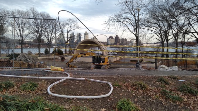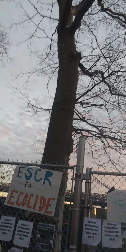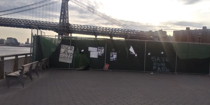Which means the NYPD will be assisting the ESCR cabal’s contractors for as long as the East River Action demonstrators stick around and as the rest of the park gets destroyed. They will surely be here even when the landfill and the thousand new saplings arrived a half decade from now and probably when those saplings will finally reach maturity after two decades. Which is why now is a good time to see the cabal that’s behind this brazen political patronage land grab.