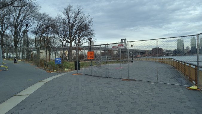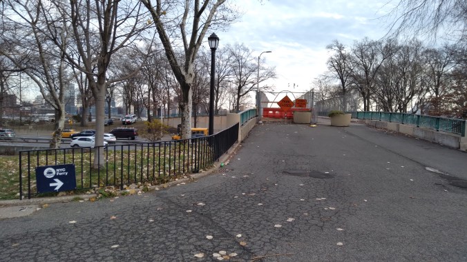 The reason why this access to the East River Park was still available is because de Blasio’s beloved NYC Ferry has a pier stop there. Which is fucking hysterical considering that for all the urgency to platform this park by hook and crook to prepare it for flood mitigation you think that he would suspend that ferry stop, especially since there is only way out. But not when it comes to one of the vainglorious Mayor’s pet favorite projects, even if it’s another wasteful boondoggle catering to mostly wealthy city commuters and tourists.
