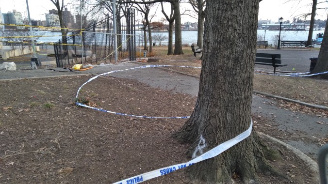 The police tape around the trees have seem to have lost their elasticity. But the NYPD is still hanging around to make sure the “resiliency” project doesn’t get disrupted ever again.
