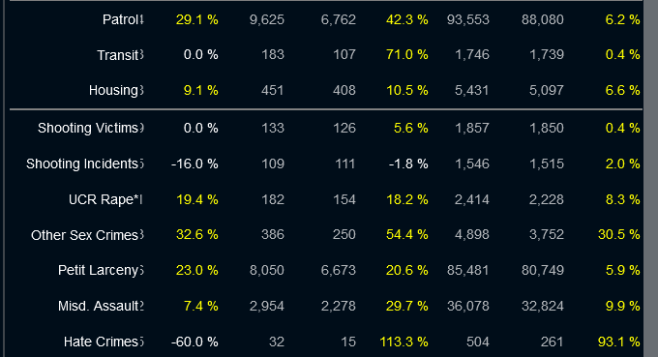 With the exception of burglary which went down mostly because people are still home or not working because of the continuing pandemic (which the Blaz prolonged with his idiotic mandates but that’s another post for another day), all other felony index crimes went up, notably murders and shootings which have not reached these plateaus in nearly 20 years. Rapes and sexual assaults also saw distressing inclines as well as muggings and car theft. The biggest crime wave that enveloped the city were hate crimes with most of the bias attacks being committed against Asians and Jewish people by predominantly Black people, although most of the aggressors were emotionally disturbed.