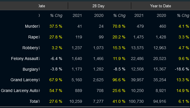 With the exception of burglary which went down mostly because people are still home or not working because of the continuing pandemic (which the Blaz prolonged with his idiotic mandates but that’s another post for another day), all other felony index crimes went up, notably murders and shootings which have not reached these plateaus in nearly 20 years. Rapes and sexual assaults also saw distressing inclines as well as muggings and car theft. The biggest crime wave that enveloped the city were hate crimes with most of the bias attacks being committed against Asians and Jewish people by predominantly Black people, although most of the aggressors were emotionally disturbed.