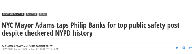 But like his fiendish predecessor The Blaz, Adams has sadly tainted her moment and this city with the quickness by bolstering a close friend and his kid brother to official high brass NYPD positions practically right beside her. Even more warped that he pulled this machination stunt on a fucking snow day while Adams was working remote in his basement of the rowhouse he owns in Bed-Stuy, Brooklyn. As the last sprinkles of the first snowfall of the year came down and while he was producing another stupid video about getting stuff done on the @NYCMayor twitter account, his longtime friend and mayoral campaign advisor Phillip Banks appointed himself as the new Deputy Mayor of Public Safety.