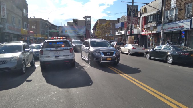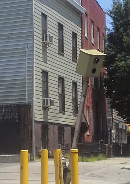 The re-affixing of this red light camera is clearly a worse offense than the annoying ads, for not only that it has made a perpetual daily car derby on Liberty more perilous, but it shows how extreme civil disobedience can be when the government and bureaucracy push people too far. It was not long ago when a gunslinger on a bicycle emptied his clip and shot up a red light camera in Woodhaven by Atlantic Ave. not long ago too. So traffic anarchy will continue in Little Guyana until the Department of Transportation stops worrying about a fringe minority of bike actorvists whining about childproofing bike lanes and actually gets serious about Vision Zero and restores vision to this zombie camera.