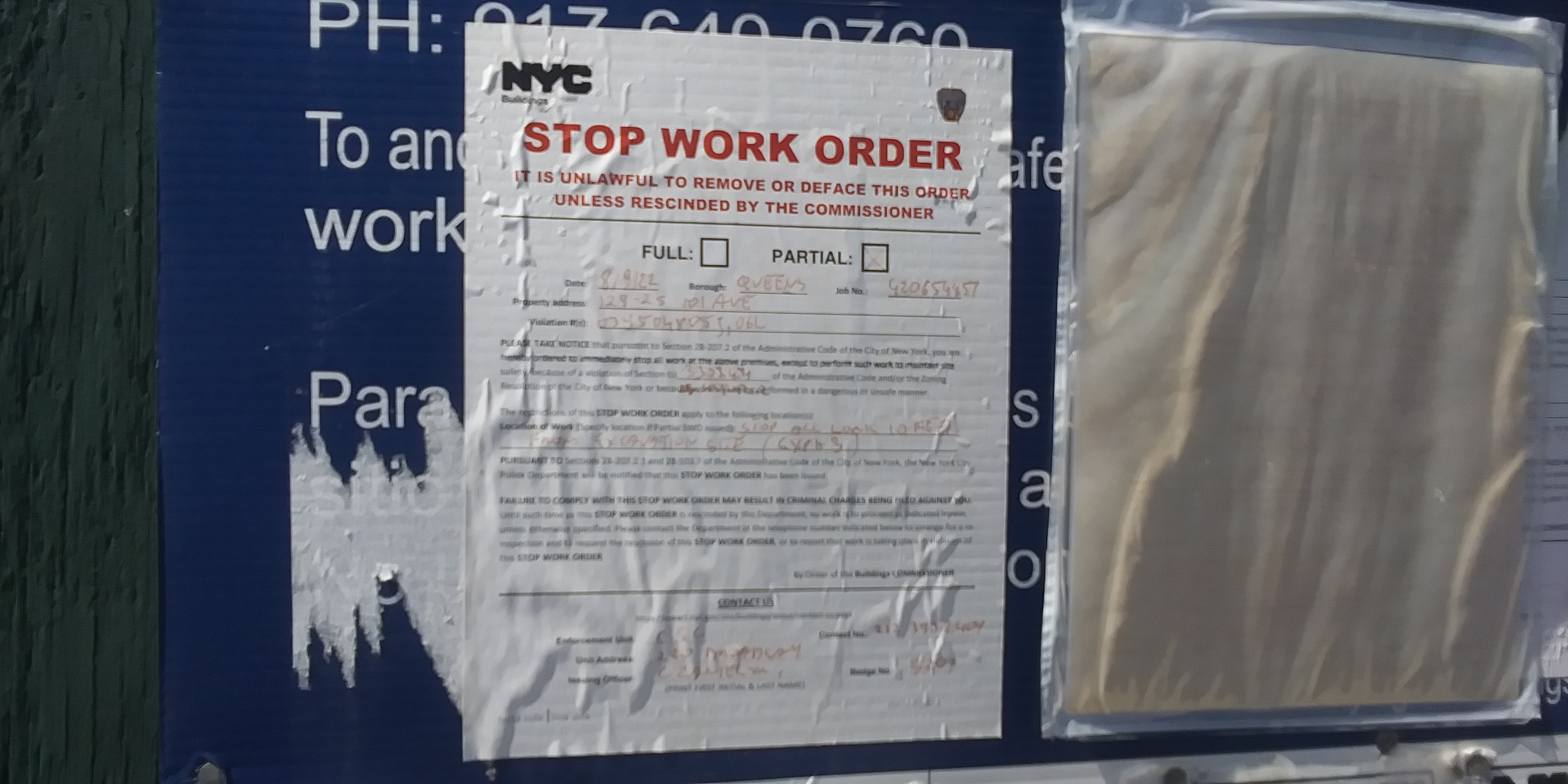 What’s funny about this is that on the day I took that photo when that NYC ordinance was plastered on the wall, an apparition appeared on the second floor window, but it turned out to be a contractor. Even though the D.O.B. didn’t approve any work inside the building until the end of September.