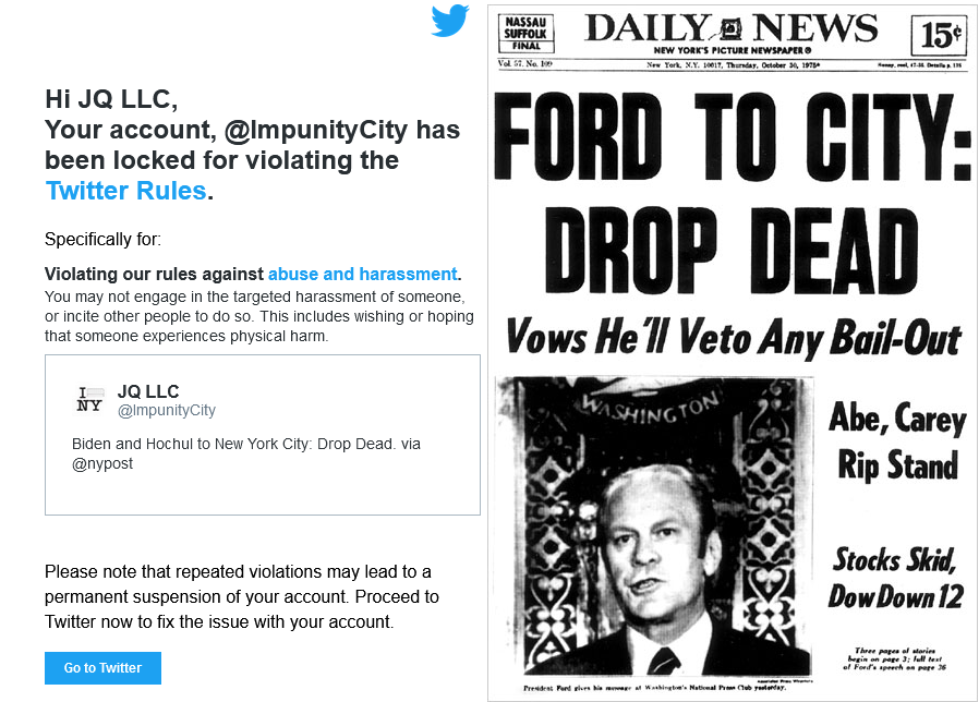 Apparently, Twitter thought my tweet that paraphrased a historic and iconic NY Daily News Headline from 1975 by substituting President Joe Biden and Governor Kathy Hochul for Gerald Ford’s for ignoring and neglecting New York City’s financial dire straits from the drastic funding of the migrant crisis like how President Ford did when NYC was also suffering from budget woes was not an apt comparison and criticism against them but a directed verbal threat against them to end their lives or a threat against New York City channeling those awful politicians? Either/or, it seems that Twitter’s new engineers that Elon Musk hired are flagging words for violence despite the obvious context.