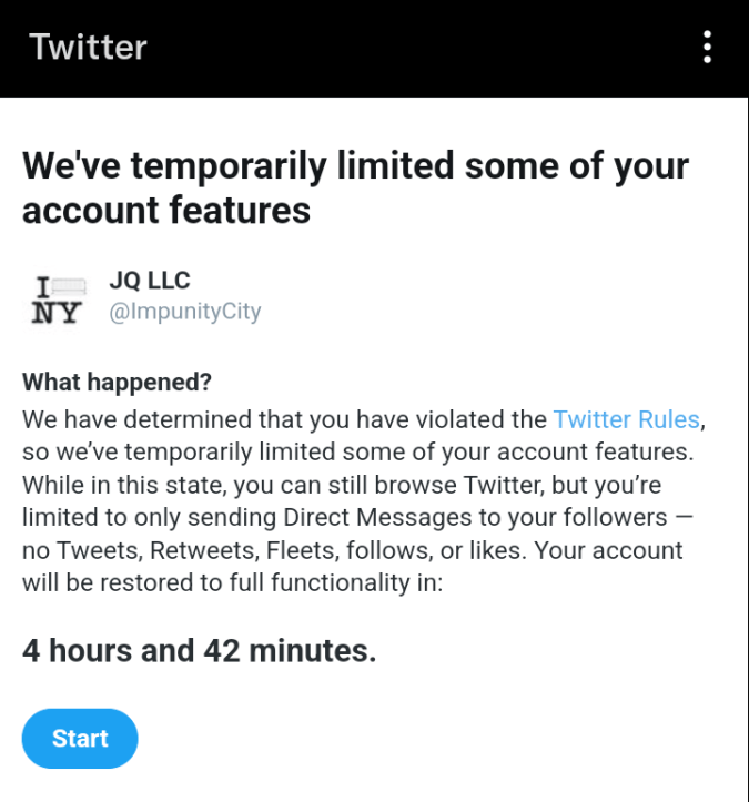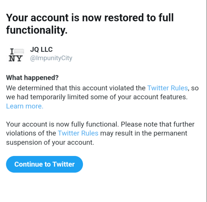 I can’t help but think that this lockdown was an attempt at intimidate me from criticizing two powerful and inherently corrupt Democrats than just an honest technical mistake and it sure looks like Twitter hasn’t stopped acting like a defacto government agency assigned to protect them. Because after my timeout ended, the message before my account was restored was nothing less than menacing that if I break the Twitter rules of violent speech again, my thoughts, words and voice would be silenced on the platform forever once again.